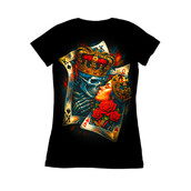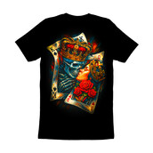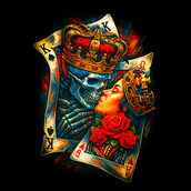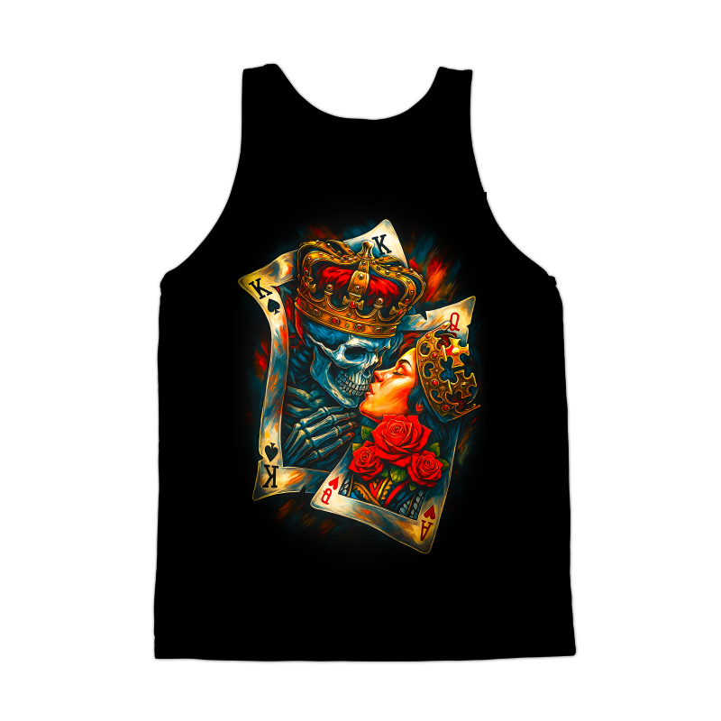 This design presents a striking juxtaposition of life and death, love and fate, embodied in the figures of a crowned skeleton and a queen, set against the backdrop of playing cards. The King of Spades is represented by the skeleton, adorned with an ornate crown, symbolizing power and mortality. The Queen of Hearts is depicted as a beautiful woman with a golden crown, her face turned towards the skeleton in an intimate, almost kiss. Red roses add a touch of romance, contrasting with the macabre nature of the skeleton. The artwork employs vibrant colors and dramatic shading to enhance the emotional impact, creating a visually arresting scene. The overall effect is a blend of dark romance and symbolic imagery, inviting viewers to contemplate themes of love, death, and destiny.