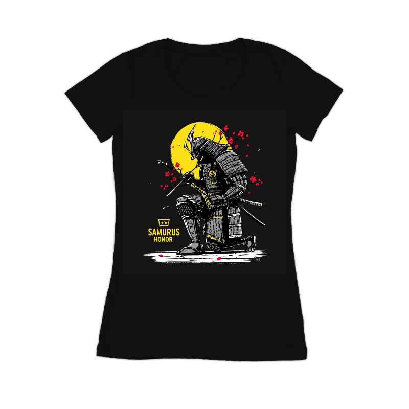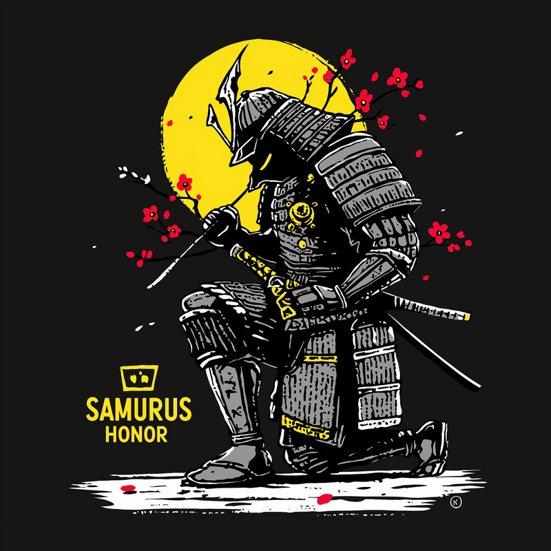 This striking illustration depicts a samurai warrior kneeling in a pose of respect or contemplation. The samurai is clad in detailed, traditional armor, rendered in a bold, graphic style with strong lines and shading. Behind the warrior, a large, stylized yellow moon provides a dramatic backdrop, complemented by delicate branches of red cherry blossoms. The overall color palette is stark, with blacks, grays, and yellows dominating, punctuated by the vibrant red of the blossoms. The design includes stylized text reading 'Samurus Honor,' adding to the thematic elements of the artwork. The composition is balanced, drawing the eye to the central figure while incorporating elements of nature and symbolism.