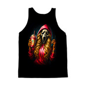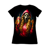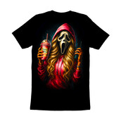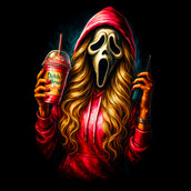 This design features the iconic Ghostface mask from the 'Scream' horror franchise, but with a modern, humorous twist. The character is depicted wearing a red hoodie and sporting long, flowing blonde hair, holding a Dutch Bros coffee drink in one hand and a walkie-talkie in the other. The artwork is vibrant and eye-catching, with bold colors and dynamic shading that give the image a sense of depth and energy. The blend of horror and pop culture elements makes this design unique and appealing. It is a playful take on a classic horror icon. The design is perfect for apparel, stickers, posters, and other merchandise. It will resonate with fans of the 'Scream' movies, as well as those who enjoy a touch of humor in their horror-themed items.