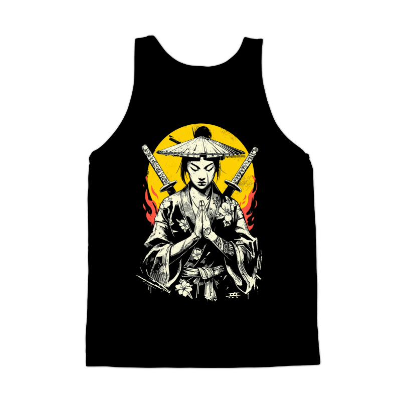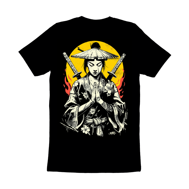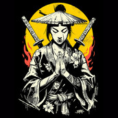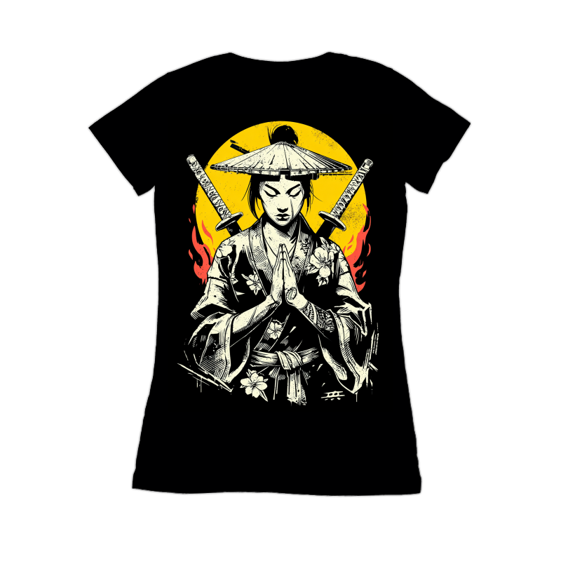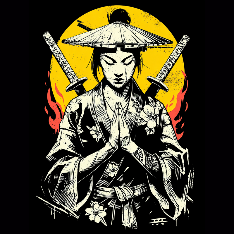This striking illustration features a female samurai warrior in a moment of quiet contemplation. She is depicted with her hands in a prayer-like pose, wearing a traditional kimono adorned with floral patterns and a conical hat. Two katanas are crossed behind her, hinting at her readiness for battle. The design employs a limited color palette of black, cream, and a touch of red for the flames in the background, creating a high-contrast and visually arresting image. The style is reminiscent of woodblock prints, with bold lines and textured shading adding depth and character. The overall composition is balanced and harmonious, blending strength and serenity.
