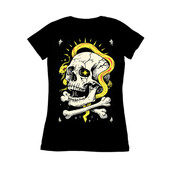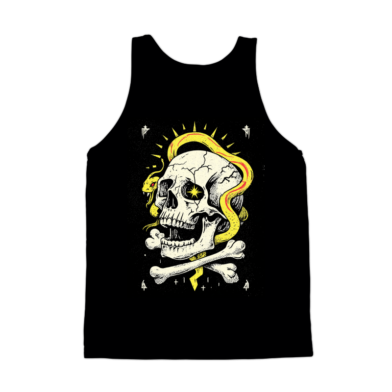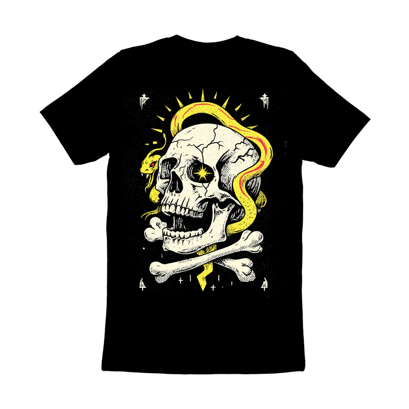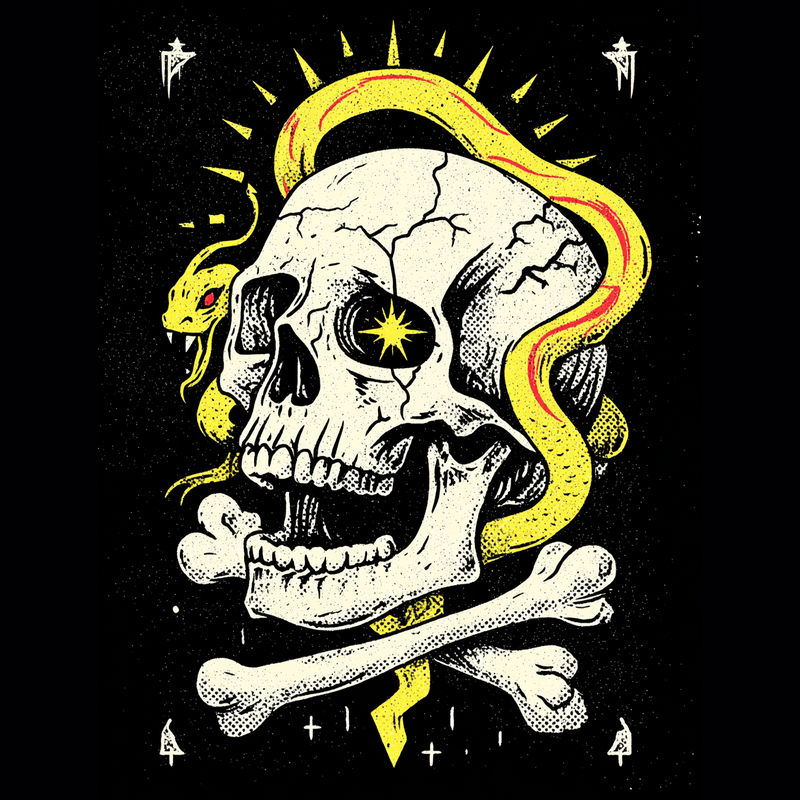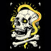 This striking design features a skull entwined with a serpent, rendered in a bold, graphic style. The skull, detailed with cracks and a star-shaped eye socket, rests above crossed bones, adding a classic touch of morbidity. A vibrant yellow snake wraps around the skull, its scales and form adding a dynamic contrast to the bone's static nature. The design is set against a black background, enhancing the visual impact of the skull and snake. Small, stylized symbols float in the upper corners, contributing to the design's mysterious and edgy aesthetic. The overall effect is a blend of classic tattoo art and modern graphic design, making it a versatile choice for various creative projects.