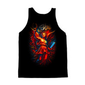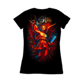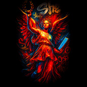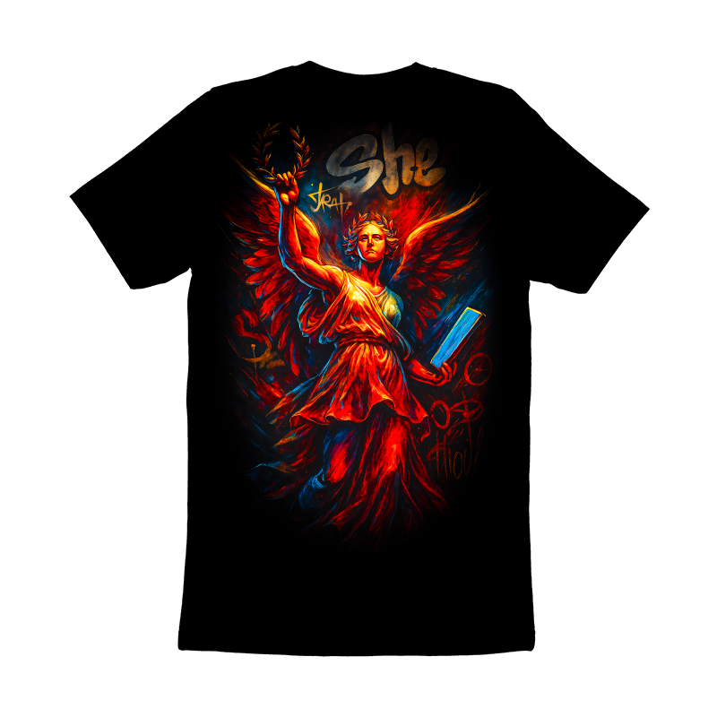 This striking design features a modern interpretation of a classical figure, rendered in a dynamic graffiti style. The central figure, a winged woman adorned with a laurel wreath, evokes a sense of victory and wisdom. Her flowing dress and powerful stance are reminiscent of ancient Greek or Roman sculptures, yet the vibrant color palette and bold outlines bring a contemporary edge. Splashes of red, orange, and blue create a sense of energy and movement, contrasting with the dark background. The word "She" is scrawled above, adding to the urban feel. The design blends classical art with street art aesthetics, creating a unique and eye-catching visual.
