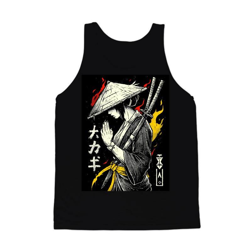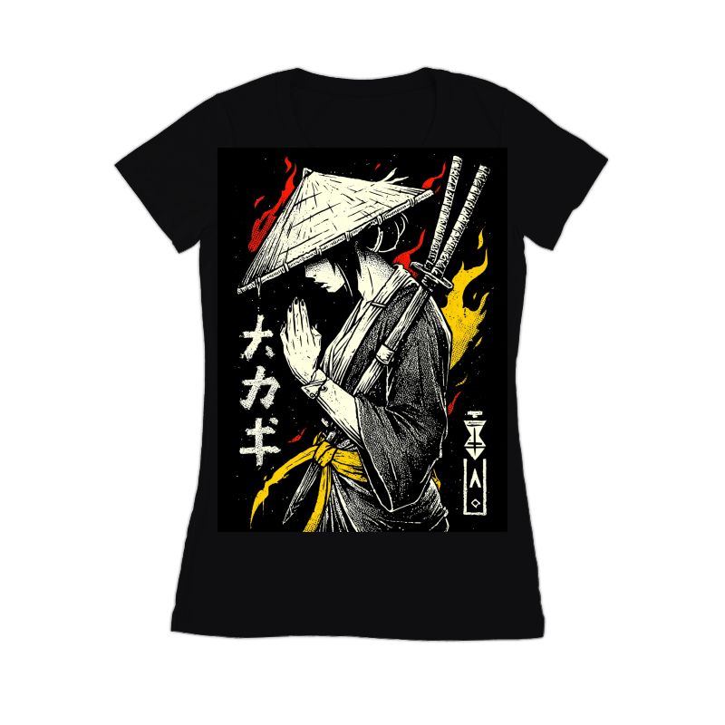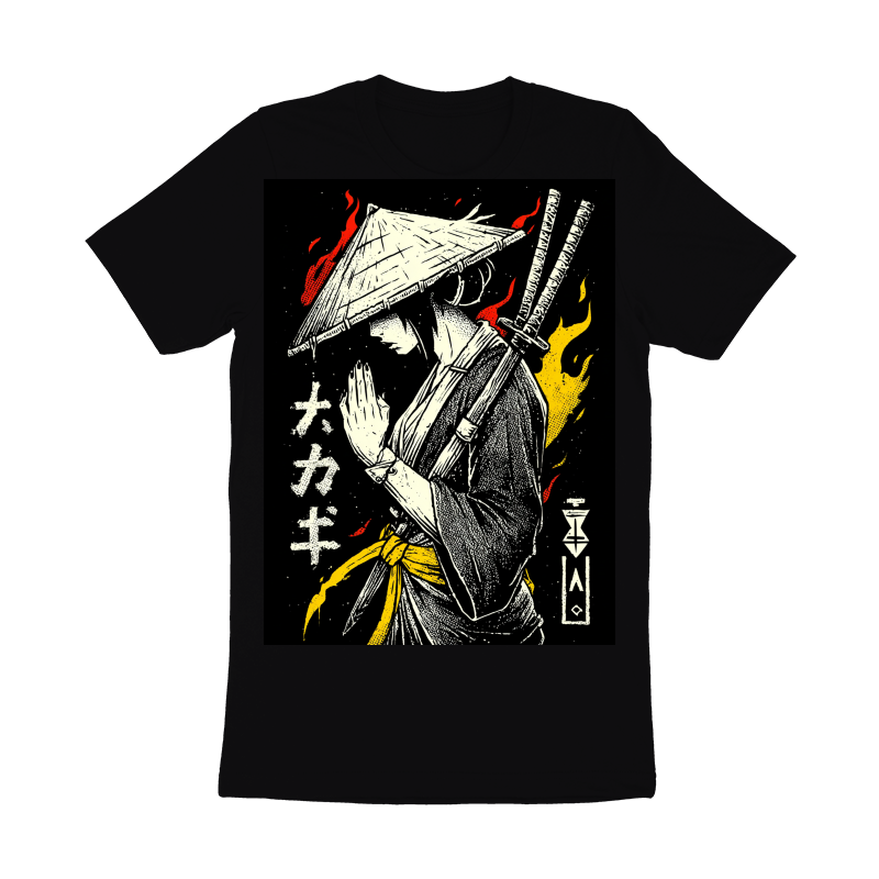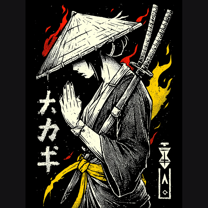 This artwork presents a stylized depiction of a samurai, rendered in a striking monochrome palette accented with vibrant red and yellow flames. The samurai, adorned in traditional attire, stands in a moment of quiet contemplation, hands clasped in a gesture of respect or meditation. Two katana swords are slung across their back, hinting at readiness and martial prowess. The design incorporates Japanese text and geometric symbols, adding an authentic cultural layer. The use of halftone textures gives the image a vintage, screen-printed aesthetic, enhancing its visual appeal. The overall composition balances strength and serenity, making it a captivating piece.