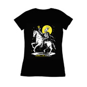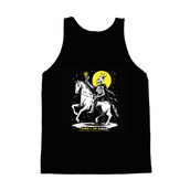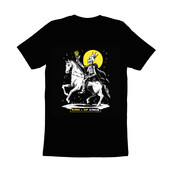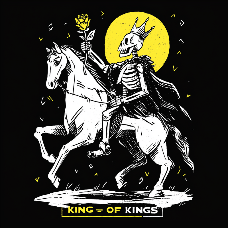 This striking design features a skeletal figure, crowned and cloaked, riding a majestic white horse. The skeleton holds a yellow rose, contrasting with the dark background and adding a touch of morbid elegance. A bright yellow moon provides a dramatic backdrop, enhancing the eerie yet regal atmosphere. The artwork employs a linocut or woodcut style, with bold lines and textured surfaces that give it a vintage, handcrafted feel. The phrase 'KING = OF KINGS' is emblazoned at the bottom, reinforcing the theme of death and royalty. The overall composition balances darkness and light, creating a visually compelling and thought-provoking image.