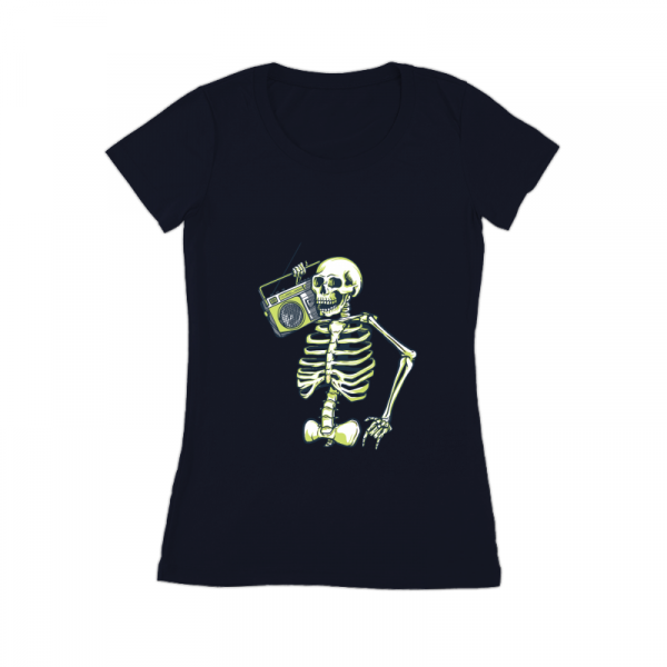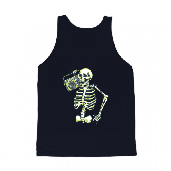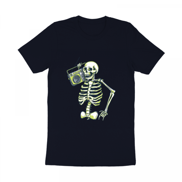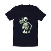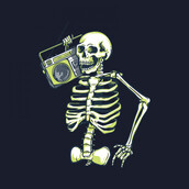 Skeleton Music Radio is a vintage illustration that is suitable for apparel or merchandise about skull, skeleton, horror, halloween, scary, ghost, trick or treat, music, radio, podcast, dj, audio, karaoke.
