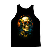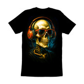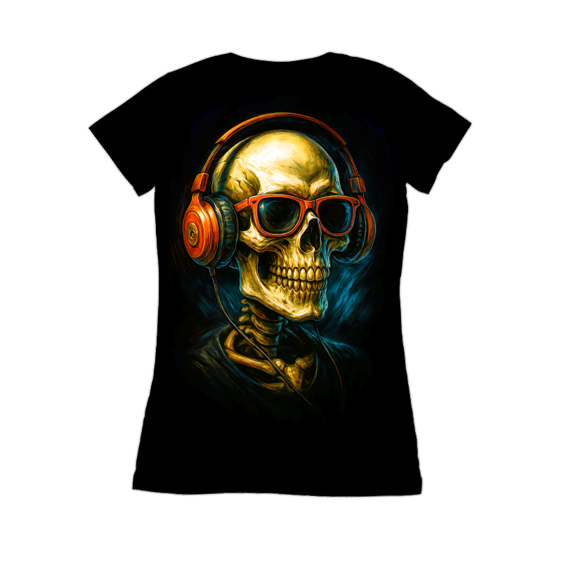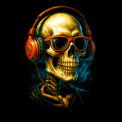 This design features a skull rocking out with headphones and sunglasses. The skull is rendered in a vibrant yellow and gold palette, with contrasting blue shadows adding depth and dimension. The headphones are a striking orange, drawing the eye and emphasizing the musical theme. The sunglasses add a touch of cool, giving the skull a modern edge. The overall style is reminiscent of airbrush art, with smooth gradients and bold outlines. The background is dark, which makes the skull pop. The design blends elements of edgy street art with classic skull imagery, creating a visually striking and versatile piece. Designers can use this image for music-related products, apparel, posters, and album art. The bold colors and edgy style make it suitable for a younger audience. It would also work well for Halloween-themed designs or for brands looking to convey a rebellious attitude. The design is suitable for both digital and print applications.