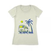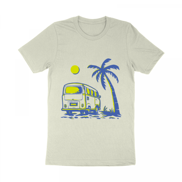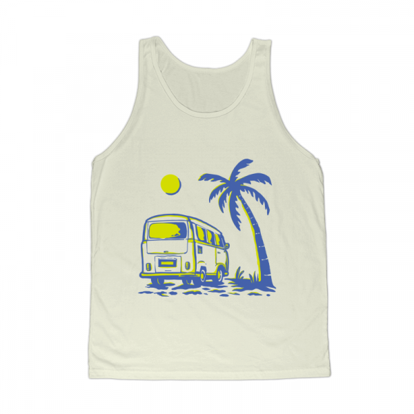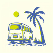 Summer Vacation Travel is a vintage illustration that is suitable for apparel or merchandise about summer, vacation, holiday, travel, beach, tropical, surfing, van, vehicle, paradise, surfboard, car, island, bus, camper van, caravan.