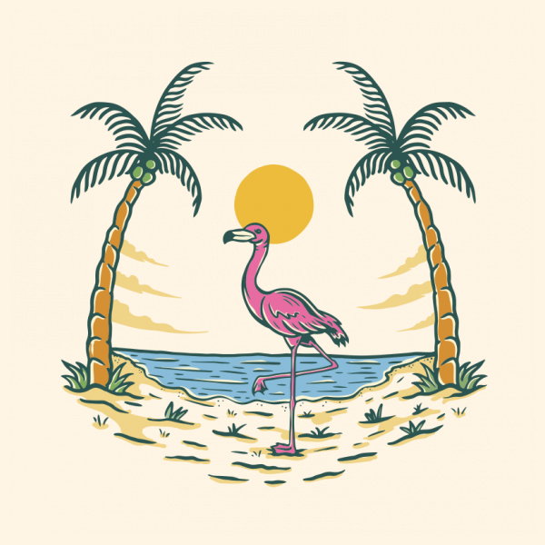 Summer Vibes Flamingo is a vintage illustration that is suitable for apparel or merchandise about summer, vacation, holiday, travel, beach, tropical, surfing, flamingo, bird, animal, cute, pet, paradise.