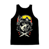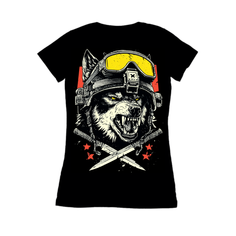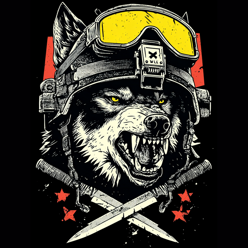 This striking design features a fierce wolf warrior, rendered in a bold, graphic style. The wolf is depicted wearing a tactical helmet with yellow goggles, conveying a sense of strength and readiness. Below the wolf's head are two crossed knives, adding to the design's edgy and dangerous feel. The color palette is limited to black, white, and red accents, creating a high-contrast and visually impactful image. The overall aesthetic blends elements of military and animal themes, resulting in a unique and powerful design. The design is well-suited for apparel, posters, and other merchandise.