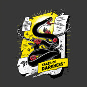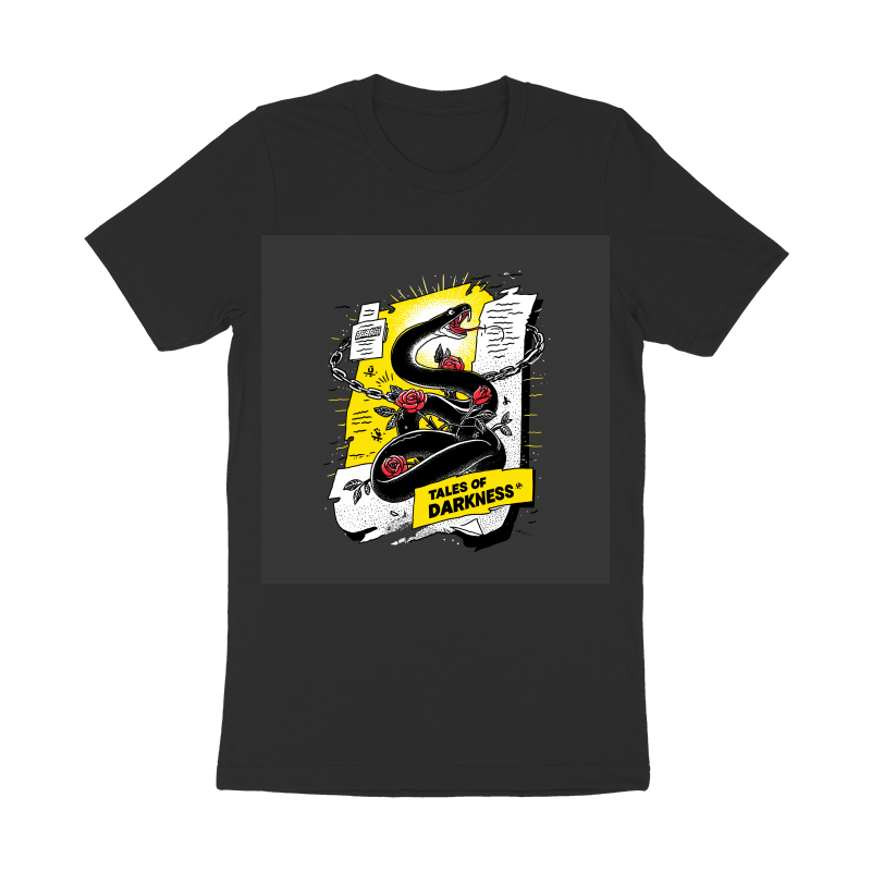 This captivating design, titled 'Tales of Darkness,' features a striking black serpent coiled amidst blooming red roses and scattered documents. The serpent, a symbol of transformation and mystery, is bound by a delicate chain, hinting at constraint or hidden knowledge. The roses, traditionally associated with love and passion, offer a stark contrast to the serpent's dark allure. The background consists of scattered documents, adding an element of intrigue and narrative. The design employs a bold, illustrative style with strong outlines and a limited color palette, enhancing its visual impact. The words 'Tales of Darkness' are emblazoned on a yellow banner, reinforcing the design's thematic focus. Overall, the artwork evokes a sense of dark romance and forbidden knowledge, making it suitable for a variety of applications.