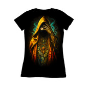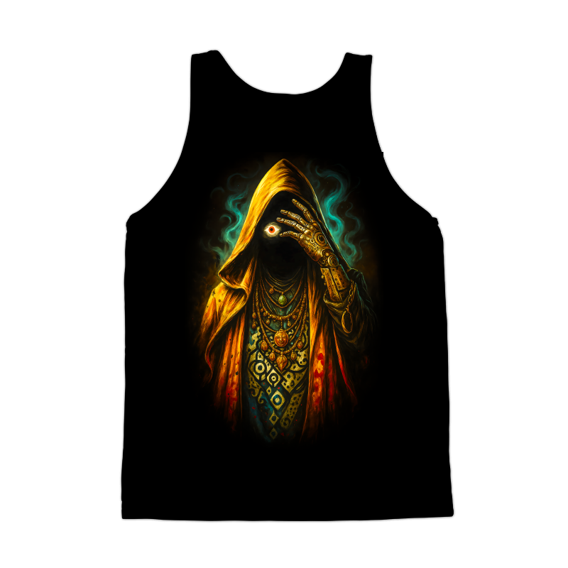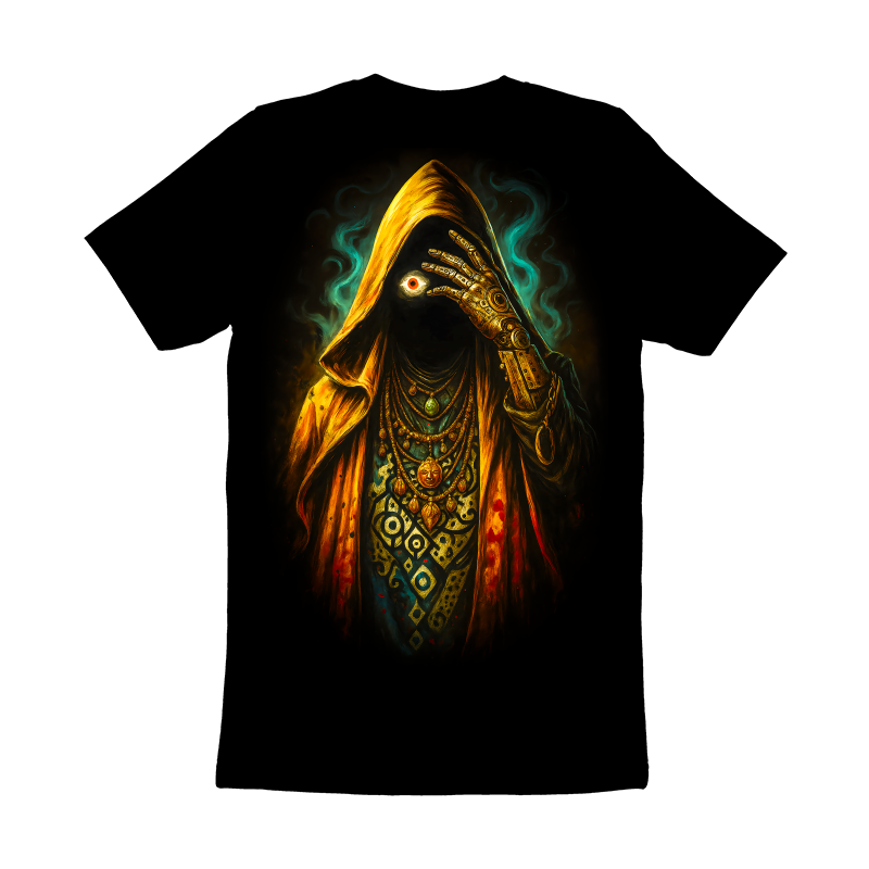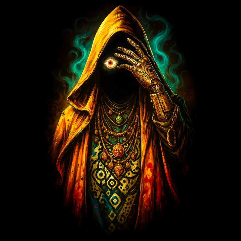 This artwork presents a mysterious figure cloaked in shadow and draped in rich fabrics and ornate jewelry. The figure's face is obscured by a hood, with only a single, intense eye visible, lending an air of otherworldly knowledge and power. One hand is crafted from intricate, clockwork-like metal, hinting at a blend of magic and technology. The robes are adorned with geometric patterns and layered necklaces, suggesting a character of high status or deep spiritual significance. Wisps of ethereal energy curl around the figure, enhancing the mystical atmosphere. The color palette is dominated by golds, greens, and blues, which contrasts against the stark black background, drawing the viewer's eye to the focal point. The overall effect is captivating, blending elements of fantasy, steampunk, and the arcane. Designers could use this image for book covers, particularly in the fantasy or sci-fi genres. It would also work well for posters, album art, or as a focal point in digital art projects. The blend of mechanical and mystical elements makes it versatile for projects seeking a unique, eye-catching aesthetic. Its intricate details and striking composition could easily draw viewers in.