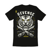 This striking design features a fierce tiger head rendered in a bold, distressed style. The tiger's intense yellow eyes and bared teeth convey a sense of raw power and aggression. Below the tiger, two crossed daggers add to the design's dangerous and rebellious feel. The words "REVENGE" are emblazoned above the tiger in a blocky, distressed font, while "FEAR NO FOE" appears below the daggers, reinforcing the theme of fearless retribution. The design incorporates a limited color palette of black, white, and yellow, enhancing its gritty, vintage aesthetic. Small details like the broken chain links and scattered stars add to the overall sense of chaos and intensity.