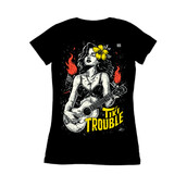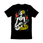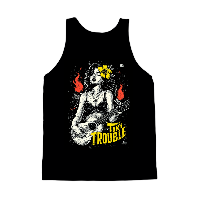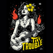 This design, titled 'Tiki Trouble,' features a vintage-inspired aesthetic with a modern twist. The central figure is a woman with a flower in her hair, playing a ukulele. Two flaming torches flank her, adding a touch of danger and excitement to the scene. The design uses a limited color palette, primarily black, white, and yellow, which enhances its retro feel. The textures are distressed, giving the artwork a worn and authentic look. The typography, reading 'Tiki Trouble,' is bold and stylized, fitting the overall theme. The design evokes a sense of tropical adventure and musical allure, blending elements of vintage pin-up art with Tiki culture.