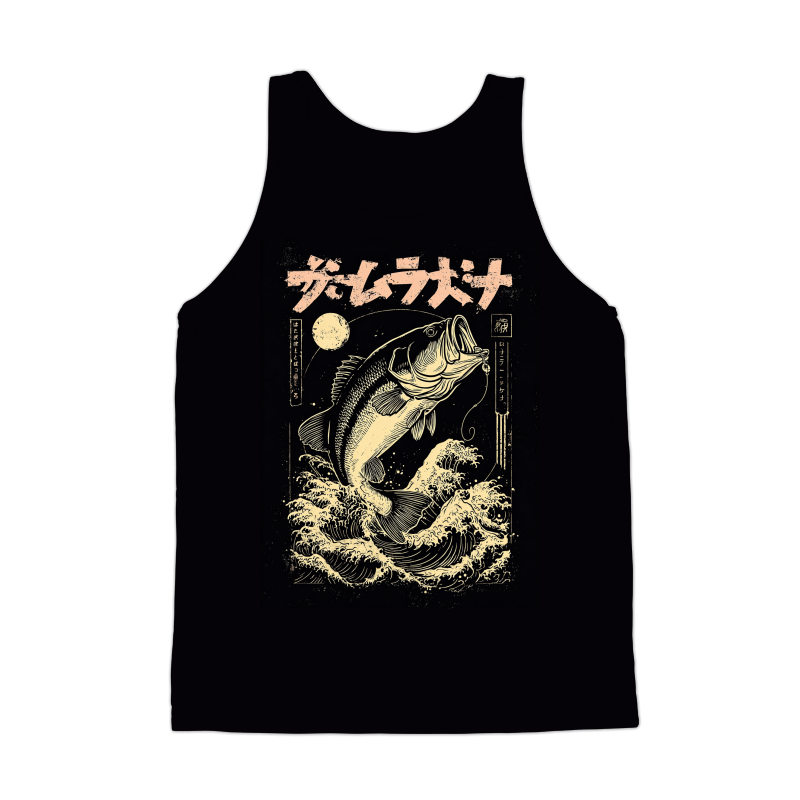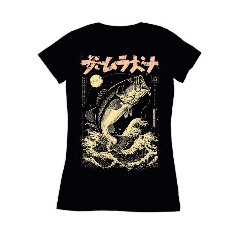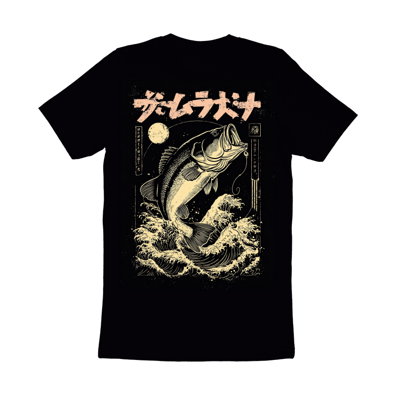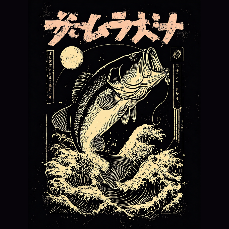 This striking design blends the thrill of bass fishing with the timeless elegance of Japanese Ukiyo-e art. A largemouth bass, rendered in detailed linework, bursts from a sea of stylized waves. The composition is framed by Japanese text and a circular moon, adding to the authentic feel. The color palette is limited to black and a vintage cream, enhancing the retro aesthetic. The design evokes classic Japanese woodblock prints, with a modern twist that appeals to fishing enthusiasts and art lovers alike. The textures and patterns mimic the look of aged paper, giving the design a sense of history and authenticity. This unique piece captures the spirit of the outdoors and the beauty of traditional art.