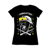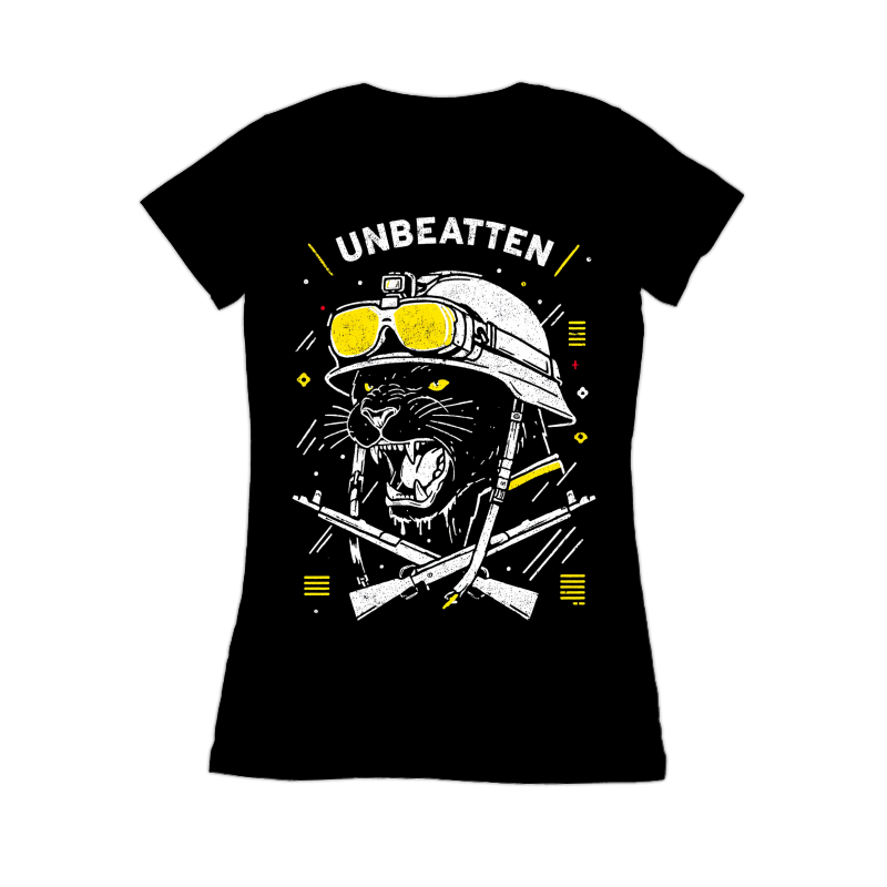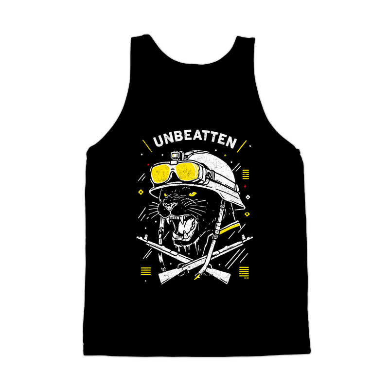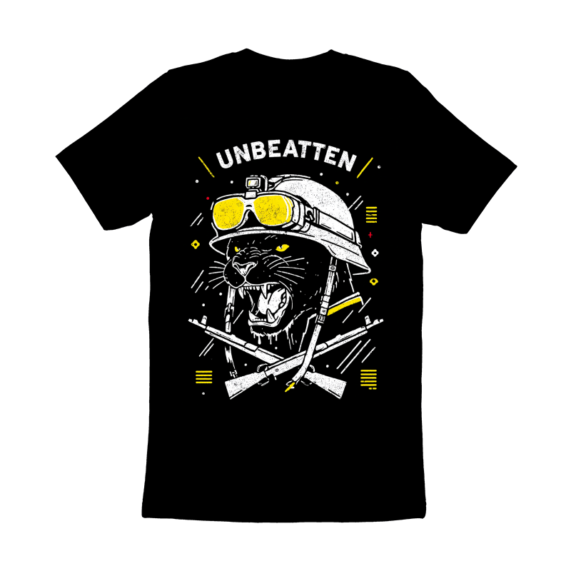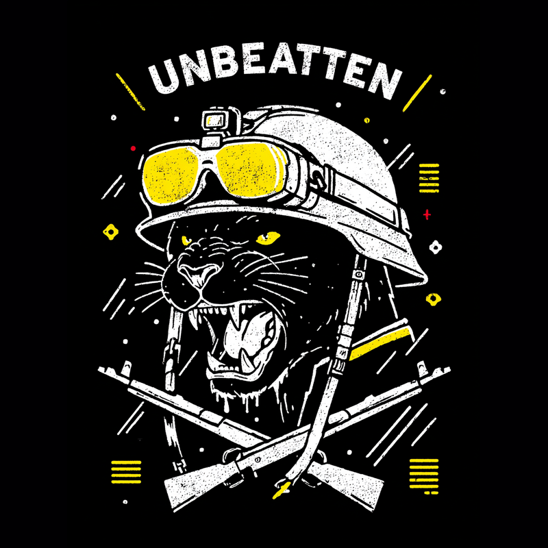 This striking design features a fierce black panther, rendered in a bold, graphic style with white line work against a black background. The panther is depicted wearing a military helmet with goggles and a camera mounted on top, adding a modern, tactical edge. Below the panther are two crossed rifles, further emphasizing the warrior theme. The word "UNBEATTEN" is emblazoned above the panther in a strong, sans-serif font. The overall aesthetic blends elements of wildlife art with military iconography, creating a powerful and unique visual statement. The design incorporates small yellow accents, adding pops of color that draw the eye. The distressed texture gives it a vintage, battle-worn feel.