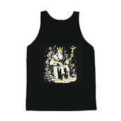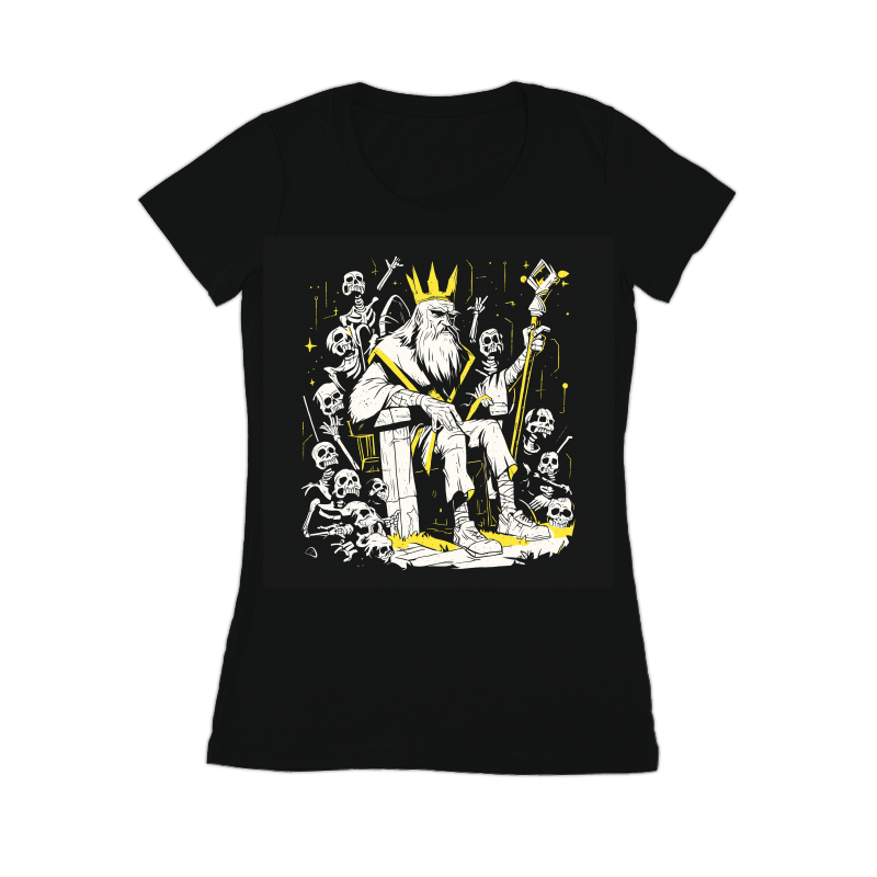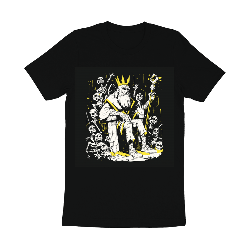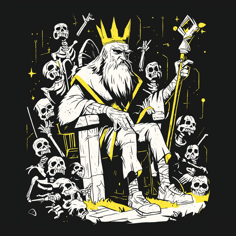 This striking vector art depicts a regal, yet decaying, king seated on his throne, surrounded by a court of skeletons. The king, with a long white beard and a stern expression, wears a crown and holds a staff, symbolizing his authority even in death. The skeletons, in various poses, add a macabre and eerie atmosphere to the scene. The color palette is limited to black, white, and a muted yellow, enhancing the design's stark and dramatic feel. The style is reminiscent of classic comic book art, with bold lines and strong contrasts. The overall composition creates a sense of dark fantasy and gothic horror, making it a visually compelling and unique piece.