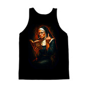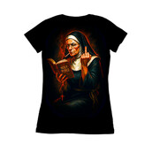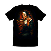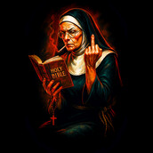 This design features a striking and provocative image of a nun, rendered in a style that blends elements of traditional religious iconography with a decidedly irreverent edge. The nun is depicted with a cigarette in her mouth, holding a Holy Bible, and extending her middle finger. The artwork is rich in detail, employing dramatic lighting and bold color contrasts to enhance its visual impact. The nun's face is etched with character, conveying a sense of defiance and world-weariness. The overall composition is carefully balanced, drawing the viewer's eye to the central figure and her conflicting symbols of piety and rebellion. This design challenges conventional notions of religious imagery, offering a subversive twist on familiar themes.