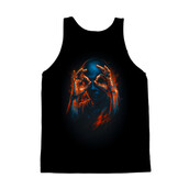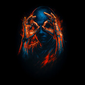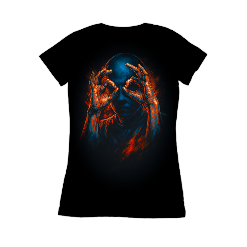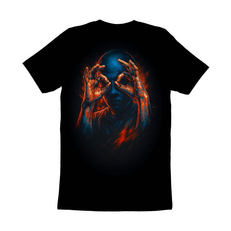 This striking design features a figure rendered in a dramatic chiaroscuro style, dominated by deep blues and vibrant oranges. The subject's face is largely obscured in shadow, drawing attention to the hands that frame the eyes in an 'OK' gesture. The hands are vividly detailed, with a fiery orange hue that contrasts sharply against the cool blue tones of the face and upper body. This contrast creates a sense of depth and visual interest, highlighting the act of seeing or observing. The overall effect is both mysterious and captivating, hinting at themes of perception, hidden knowledge, or perhaps even a commentary on modern expressions. The use of light and shadow adds a layer of complexity, inviting viewers to interpret the meaning behind the gesture and the obscured face. The design evokes a sense of intrigue and quiet intensity.